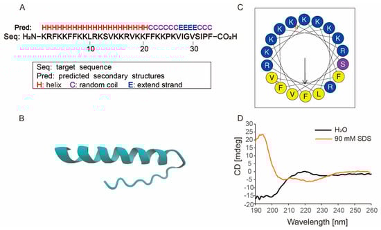 The genome of sea snake Hydrophis cyanocinctus in the National Center for Biotechnology Information (NCBI, genome ID: 75161) was blasted with NCBI NR (release 2022_02, https://ftp.ncbi.nlm.nih.gov/blast/db/FASTA/nr.gz, accessed on 5 April 2022), Swiss-Prot (release 2022_03, https://www.uniprot.org/, accessed on 10 April 2022) and CAMPR3 (release 2021_10, http://www.camp.bicnirrh.res.in/, accessed on 20 April 2022) to perform gene function annotation. According to the annotated information, the target gene sequence was translated into amino acids, and its terminal was determined by AMPA (https://tcoffee.crg.eu/apps/ampa/do, accessed on 3 May 2022), CAMPR3 (http://www.camp3.bicnirrh.res.in/, accessed on 6 May 2022), and DBAASP server (https://dbaasp.org/home, accessed on 8 May 2022). The physical and chemical properties of peptide were analyzed through ExPASy (https://web.expasy.org/protparam/, accessed on 15 May 2022). The helix-wheel structures were constructed by HeliQuest (https://heliquest.ipmc.cnrs.fr/, accessed on 17 May 2022). Three-dimensional structure was obtained by QUARK (https://zhanggroup.org/QUARK/, accessed on 21 May 2022).