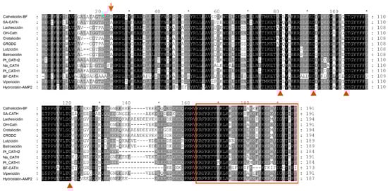 Multi-sequence alignment of Hydrostatin-AMP2 with other snake Cathelicidins. Sequences retrieved from NCBI were multi-aligned with Clustal Omega. Dashes were inserted to optimize the alignment. Highly conserved residues were shaded and identical residues were indicated in black. Arrows indicated the boundary between the signal region and the cathelin domain. The four cysteine positions at the end of the cathelin domain were indicated by triangles. The C-terminal region (mature peptide) where the antimicrobial activity resides was boxed.