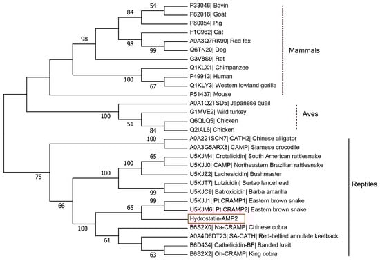 We also performed a phylogenetic analysis of Hydrostatin-AMP2 and other representative Cathelicidins of mammals, aves, and reptiles (Figure 3). Hydrostatin-AMP2 clustered with the Cathelicidins of terrestrial snakes, implying that Hydrostatin-AMP2 and the Cathelicidins of terrestrial snakes are from the same ancestor. In addition, Cathelicidins from elapids and vipers clearly formed two distinct subclusters, with Hydrostatin-AMP2 clustering with elapid Cathelicidins, suggesting that Hydrostatin-AMP2 is more closely related to elapid Cathelicidins.