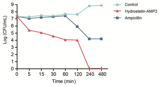 Killing kinetics of Hydrostatin-AMP2 against E. coli. After incubation with Hydrostatin-AMP2 or Ampicillin for a different time, CFU was determined by serial dilution agar plating method. Data represent mean ± SD values of three independent experiments performed in triplicate.