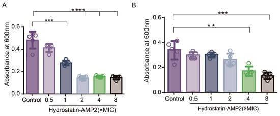 Effects of Hydrostatin-AMP2 on S. aureus biofilm. (A) Biofilm inhibition activity of Hydrostatin-AMP2. (B) Biofilm eradication activity of Hydrostatin-AMP2. Data represent mean ± SD values of three independent experiments performed in quintuplicate. **, p < 0.01; ***, p < 0.001; ****, p < 0.0001 (significantly different compared with the control).