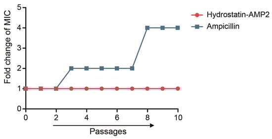 Induction of resistance was determined across the change of MIC using a method as previously described with minor modifications [43]. E. coli was inoculated into MH broth and oscillated (37 °C, 220 rpm, 12 h) to the logarithmic growth stage, and then diluted to 106 CFU/mL. With the absence or presence of 0.5×MIC Hydrostatin-AMP2 or Ampicillin, each panel culture oscillated for 12 h. MIC was detected and the previous process was repeated. Every 5 generations, the strain was frozen.