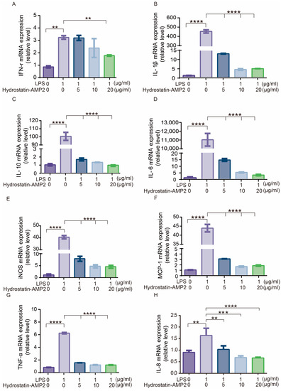 Effects of Hydrostatin-AMP2 on LPS-induced expression of pro-inflammatory factors. (A–H) Relative mRNA expression level of IFN-γ, IL-1β, IL-10, IL-6, iNOS, MCP-1, TNF-α and IL-8. Data represent mean ± SD values of three independent experiments performed in triplicate. **, p < 0.01; ***, p < 0.001; ****, p < 0.0001 (significantly different compared with the model group).