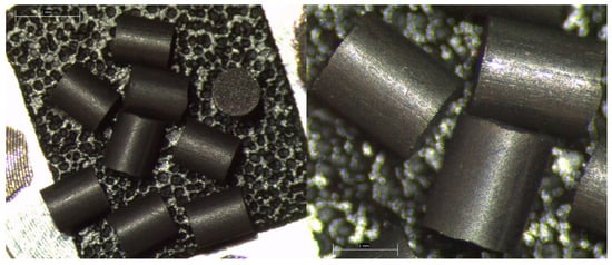 The molybdenum pellets were supplied by Luoyang Combat Tungsten & Molybdenum Material Co., Ltd. (Luoyang, China). They are shaped as small cylinders, approximately 1.7 mm long and 1.5 mm in diameter. Figure 1 shows the optical micrograph images of them in order to show the aspect and morphology. All pieces are very similar and just small variations in volume can be observed. Their surface is usually dark, probably because of the presence of a very thin layer of molybdenum oxide on the surface. Purity of the samples has been analyzed by means of ICP-mass spectrometry (see Section 3.3).
