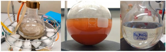 Figure 2 shows the stages of dissolution: on the left, the initial stage with ice bath and the peristaltic pump for a temperature-controlled reaction; in the center, the orange solution at the end of the dissolution with the intense orange color due to molybdenum-peroxo complexes species; on the right, the transparent solution of sodium molybdate after addition of sodium hydroxide.