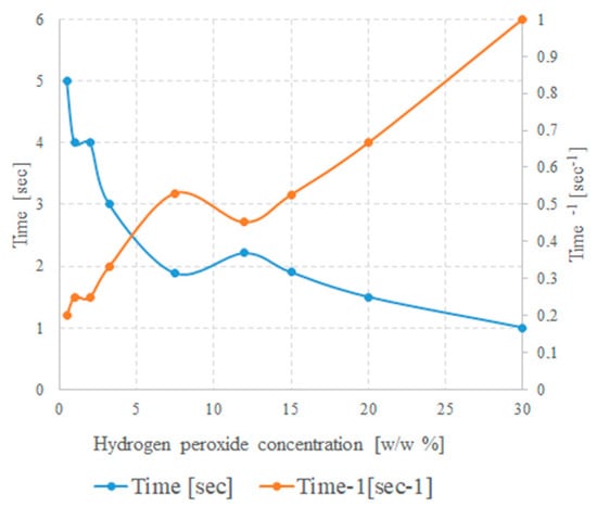 It has been observed experimentally in this study that temperature does not increase immediately when the reactants come into contact; there is an initial induction time before which the temperature remains practically constant, and, immediately after, it increases dramatically. This induction time is generally of few seconds and depends on peroxide concentration (as well as temperature and other experimental factors), suggesting that the reaction acts as if it were self-catalytic, as can be seen in Figure 3. It shows the trend of the time required for appearance of the first bubbles and its inverse as a function of concentration of hydrogen peroxide solution, when the metallic pieces are thrown into the liquid. In this case, just a few milligrams of Mo and a few milliliters of peroxide were used.