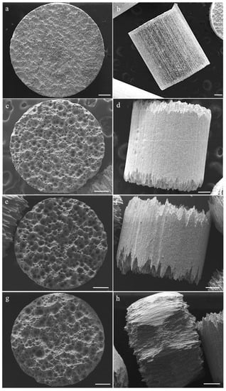 In this figure are shown low-magnification secondary electron-SEM pictures of Mo pellets dissolved in peroxide solution at different reaction times, basal (left column) and lateral (right column) overviews of: Figure 6a,b starting Mo pellets; Figure 6c,d Mo pellets after 30 minutes; Figure 6e,f after 60 minutes and Figure 6g,h after 120 minutes of reaction; all scale bars are 200 µm).