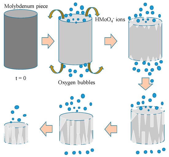 However, this oxide can be oxidized to the +VI state at higher potentials and low pH, as shown in Figure 4 regarding the E–pH diagram for pure molybdenum [40,41,42]. Hydrogen peroxide itself is a weak acid, but, as the reaction proceeds, the pH decreases so that the conditions favor dissolution.