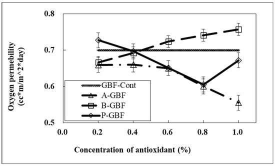 Oxygen permeability of GBFs incorporating antioxidants at various concentrations (50% RH, 23 °C). Note that GBF-Cont represents pure GBF while A-, B-, and P- stand for ascorbic acid, BHA, and phytic acid, respectively. Bars indicate the standard deviation.