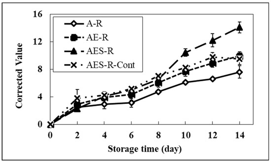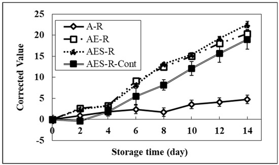As shown in Figure 5, in the calibration system, a significant increase of redness in all systems compared to the A-R system was observed from the 4th day. On day 14, the redness of the AES-R system containing the highest lipid portion (oil and emulsifier) was 14.1. This redness was 85% and 49% higher than those of the A-R system and AES-R-Cont, respectively. It was interesting that the AE-R system also showed changes in brightness and redness compared to the A-R system. This phenomenon can be explained by the fact that the emulsifier (Tween 80) used in our study is composed of two portions in the structure; one is fatty acid (oleic acid) and the other one is hydrophilic portion (polyoxylated sorbitan) as nonionic surfactant characteristics. Therefore, the change of color in the AE-R system corresponds to the degradation of the lipid portion (oleic acid), implying that the emulsifier itself could be a good source of lipid in the model system. These results suggested that the redness of each system was strongly affected by lipid oxidation, indicating that the REDOX potential using a pH indicator can be useful for measuring the degree of lipid oxidation in food systems.