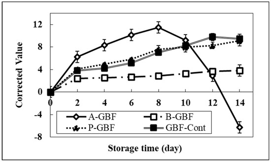 Compared with the control, GBFs incorporating 0.6% ascorbic acid showed no significant change in redness up to Day 8 (see Supplemental Figures), then its redness dropped dramatically after 8 days passed. As shown in Figure 6, the GBF containing 1% ascorbic acid showed the highest redness among all others up to Day 8, then dropped dramatically after Day 8. This implies that the higher ascorbic acid concentration played the prooxidant role, resulting in the fast lipid oxidation process at the beginning of storage time. In addition, the more rapid drop of acidity (redness) may correspond to the instability of resazurin induced by the high quantity of ascorbic acid.
