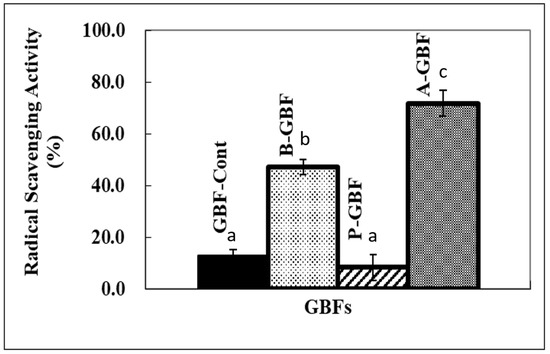 Radical scavenging activity of GBFs incorporating 1.0% antioxidants using DPPH free radical. Note that GBF-Cont represents pure GBF while A-, B-, and P- stand for ascorbic acid, BHA, and phytic acid, respectively. Bars indicate that the standard deviation and different letters (a, b, or c) are significantly different (p < 0.05).