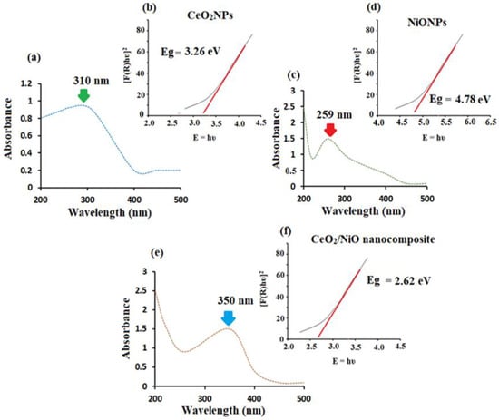 Understanding the electrical nature and the optical band gap of the material may be assessed by a study of its UV-visible absorption spectrum properties. Electronic transitions inside the sample cause absorption in the near UV range. The optical studies of the pre-synthesized CeO2NPs, NiONPs and their nanocomposite were performed at ambient temperature in the wavelength range 200–500 nm (Figure 1). The UV-vis spectra were recorded after dispersion of the nanoparticles in deionized water and ultrasonicated for 10 min. A well-defined absorption peak can be seen at a wavelength of 310 nm for the CeO2NPs. The limited size distribution of ceria nanocrystals is well-matched with the acute and strong absorption spectra with a prominent excitonic feature. In contrast with the previously reported absorption peak of CeO2NPs at 321 nm [35], it was clear that the peak was shifted towards a lower wavelength, exhibiting blue shift (Figure 1a). This showed that the sizes and morphologies of CeO2 nanoparticles have an impact on the absorption positions. The UV-vis spectrum of NiONPs showed the presence of a distinct peak at 259 nm due to the electronic transition taking place between both valance and conductive bands (Figure 1c) [36]. However, the absorption spectrum of the CeO2/NiO nanocomposite showed an absorption band at 350 nm (Figure 1e). It is worth noting that, when CeO2 was loaded onto NiO, the absorption edges exhibited a red shift and an increase in absorption in both the UV and visible bands when compared to pure NiO and CeO2. In other words, the addition of CeO2 successfully extended the absorption to the visible range. Furthermore, the intensity of the absorption increased, indicating that the addition of CeO2 was favorable to improving the visible-light absorption capabilities of the CeO2/NiO heterojunctions [37]. The direct optical band gap of the synthesized CeO2NPs, NiONPs, and CeO2/NiO nanocomposite was estimated using the following equation: