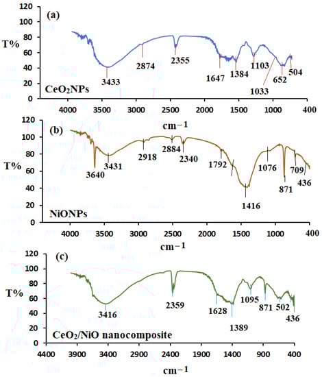 FT-IR analysis of (a) CeO2NPs (wheat husk extract), (b) NiONPs (rice husk extract) and (c) their CeO2/NiO nanocomposite, respectively, measured at 4400–400 nm.