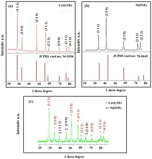XRD spectra of (a) CeO2NPs (wheat husk extract) and (b) NiONPs (rice husk extract) and (c) their nanocomposite CeO2/NiO measured at 2θ values in the range from 20–80 Å.