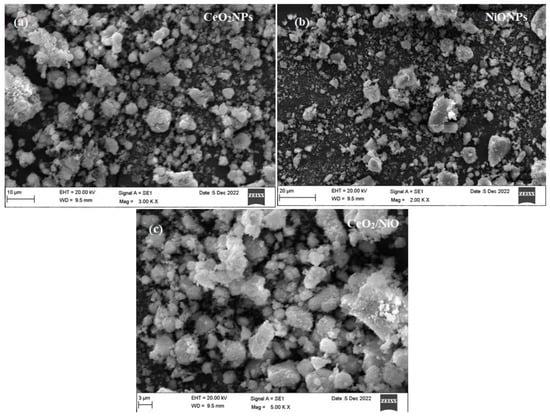 To study the surface shape and size of the green-synthesized CeO2NPs, NiONPs, and the CeO2/NiO nanocomposite, SEM images were selected and are shown in Figure 4a–c. It can be seen that the synthesized CeO2NPs and NiONPs using wheat and rice husk extracts were morphologically sphere-shaped, with narrow particles indicating significant homogeneity of particle distributions and the formation of a vast mass of spherical agglomerates (Figure 4a,b). The SEM image of the nanocomposite showed condensed masses of spherical and agglomerated particles, confirming the formation of CeO2/NiO nanocomposite (Figure 4c). The particles recorded using SEM were found to be around 100 nm for the above three described nanomaterials.
