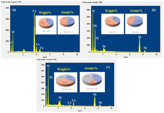 EDX mapping of the pre-synthesized CeO2NPs, NiONPs, and CeO2/NiO nanocomposite are shown in Figure 6a–c. All the results obtained for SEM, EDX and elemental mapping confirmed the successful formation of a CeO2/NiO nanocomposite.