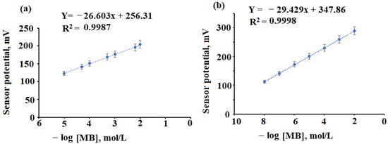 The potential response of the designed sensors was generated from the potential difference between the active sites (MB-PT or MB-PT-CeO2/NiO nanocomposite) and the MB ions in the analytical sample. The addition of o-NPOE as a plasticizer in the preparation of the coated membranes enhances the flexibility and durability of the membrane. Moreover, the presence of a plasticizer can act as an ionophore. This can be attributed to the donation sites and functional groups present in the plasticizer, which can affect the chelation of the primary analyte ion [44]. The characteristic behavior of the newly designed MB-PT and MB-PT-CeO2/NiO nanocomposite sensors was measured and is summarized in Table 1. With respect to the outcome data, the designed sensors showed Nernstian slopes of 26.603 ± 0.3 and 29.429 ± 0.2, covering 1.0 × 10−5 to 1.0 × 10−2 and 1.0 × 10−8 to 1.0 × 10−2 mol L−1 for the above-described sensors, respectively (Figure 7a,b).