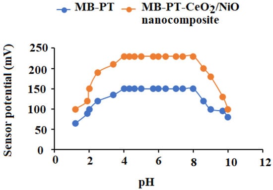 To evaluate and determine the suitable independent pH range of the designed sensors, the effect of pH on the potential readings of MB-PT and MB-PT-CeO2/NiO sensors was tested, and the findings were plotted, as shown in Figure 8. It was observed that the independent pH range that can be used safely for the determination of MB was 4–8. At the acidic medium, the potential readings were gradually increased due to the competition between the MB analyte ions and the H+ ions. However, by increasing the alkalinity of the test solution the potential response of the sensors decreased gradually due to the lower solubility of the MB in the solution and the high concentration of OH- in the test solution [45].