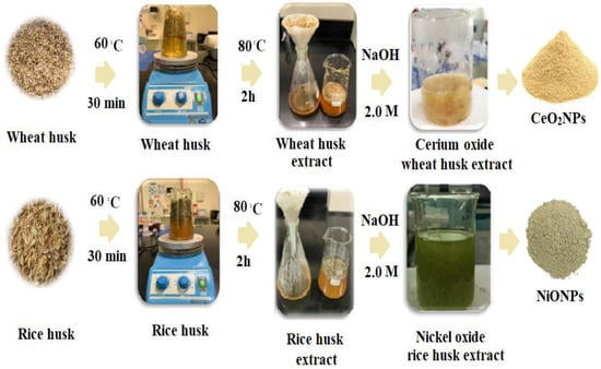 Schematic illustaration of eco-friendly synthesis of CeO2NPs and NiONPs using wheat and rice husk extracts.