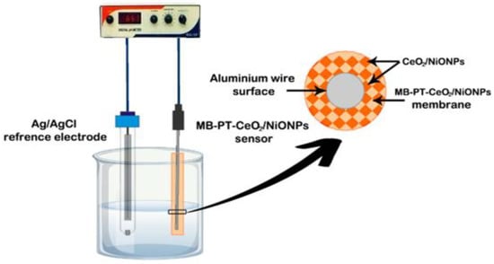 The membrane cocktail of MB-PT and MB-PT-CeO2/NiO nanocomposite was formed by mixing PVC (190 mg), MB-PT (10 mg), and o-NPOE (0.4 mL) with the organic solvent THF (5 mL). The blended mixture was poured into a rounded 3 cm diameter Petri dish and allowed to dry at ambient temperature until the formation of an oily membrane cocktail. A pure Al wire was polished and washed with acetone 3 times and then dipped in the previously prepared membrane cocktail to fabricate the coated sensor MB-PT. The functionalized mixture was prepared by the same above-mentioned procedure but approximately 10 mg of CeO2/NiO nanocomposite was added to the membrane cocktail under magnetic stirring for 10–15 min to obtain a homogeneous dispersed membrane mixture. After coating the Al wire using the functionalized mixture, the sensors were hung to dry overnight at room MB-PT-CeO2/NiO nanocomposite sensor temperature, then preconditioned by soaking the fabricated sensors in 1.0 × 10−10 mol L−1 MB solution for 12 h. Scheme 2 describes the potentiometric system using a modified MB-PT-CeO2/NiO nanocomposite sensor.