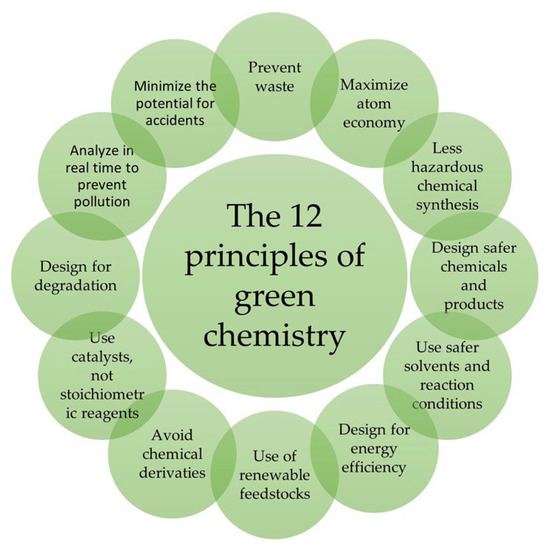 The goal of Green Chemistry is to reduce “risk” in all stages of the life cycle. “Risk” is anything that can cause consequences averse to humans or the environment. The researcher, when planning the design of a chemical compound or chemical process, must make sure to minimize risk at all levels of the process. Physical dangers (e.g., flammability, explosion), global dangers (e.g., stratospheric ozone depletion) and, above all, toxicity, must be avoided. A source of risk is the nature of the chemicals used in the reaction and their products. If researchers adhere to the twelve principles in their studies, they can, if not eliminate, at least reduce the inherent hazards of chemical products and processes. Today, the principles have been summarized into the more convenient and incisive acronym PRODUCTIVELY [13]: Prevention; Renewable materials; Omit derivatization steps; Degradable chemical products; Use safe synthetic methods; Catalytic reagent; Temperature, pressure ambient; In-process monitoring; Very few auxiliary substances; E-factor, maximise feed in product; Low toxicity of chemical products; Yes, it is safe (Figure 1).