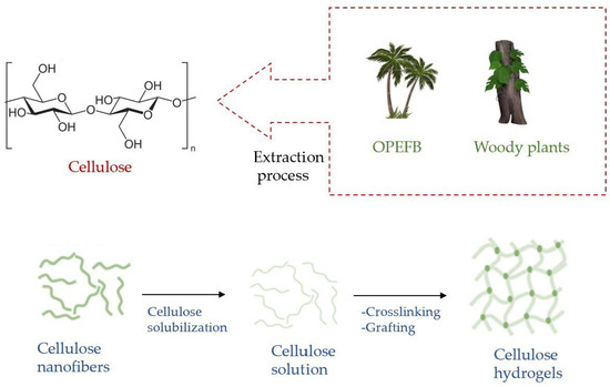 Sources of the extraction of cellulose and the formation of hydrogels.