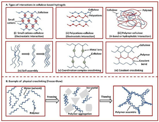 (A) Interactions in cellulose-based hydrogels in different systems. (B) representation of physical crosslinking, in particular freeze-thawing technique. (A,B) are reproduced from [58] (license CC BY 4.0).