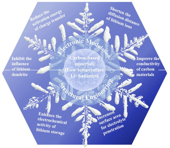 The operating and charging temperatures of conventional LIBs are between −20 °C and 60 °C and 0 °C and 60 °C, respectively. However, below 0 °C, the performance of LIBs will generally decline, and the energy and power density of LIBs using commercial electrolytes will decrease sharply when the temperature falls below −20 °C [11,12]. A number of factors, such as a decline in the conductivity of the electrolyte ions [13], an increase in the impedance value of the solid electrolyte interface (SEI) membrane [14,15], and a reduction in the rate of lithium-ion diffusion within the positive and negative electrode materials, affect the performance of LIBs at low temperatures [16,17] and result in reduced discharge capacity. The decrease in the discharge platform and discharge capacity caused by low temperature will shorten the battery lives of electrical equipment or cause them to shut down in practical applications. Under low-temperature conditions, high-rate charging will cause lithium metal precipitation, which triggers a lithium metal and electrolyte reaction involving excessive consumption of lithium and electrolyte, and results in irreversible capacity loss [18,19]. In addition, the deposition on the electrode surface increases the impedance, which further hinders the embedding of the lithium ion in the anode, and the precipitated lithium metal may form dendrites, which may puncture the diaphragm and cause a short circuit and thermal runaway in the battery. In practical application, it will shorten the service life of electrical equipment and can even create safety risks [20]. This severely limits their use in scientific exploration and areas of military strategic importance, such as in alpine and polar regions, and in space. Therefore, achieving outstanding low-temperature performance is a critical issue for resolution in the development of LIBs. A large number of research groups have reviewed extensive research advances and possess an in-depth understanding of the important variables contributing to the poor low-temperature performance of LIBs [21,22]. They sorted out the distinctive challenges on the anodes, electrolytes, cathodes, electrolyte-electrodes interphases, and so on, which highlight the importance of low-temperature LIBs [23,24,25]. In particular, many discussions have been made on the nanoadjustment of carbon-based materials for LIBs-related applications [26,27,28]. This study aims to highlight the fundamental issues relevant to the topic, including the electronic modulation and structural engineering of carbon-based anodes, as a complement to the recently published reviews of low-temperature LIBs (Figure 1). Finally, we offer our opinion on the future development of LIBs for use at low temperatures.