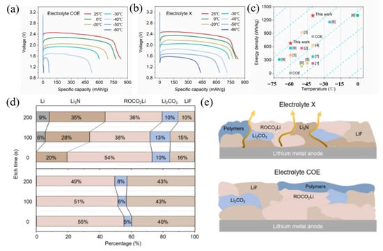 Figure 2. Discharge curves of Li/CFx primary cells using the (a) electrolyte COE and (b) electrolyte X at different temperatures (0.1 C). (c) The comparison with the same type of research on the energy densities of Li/CFx cells available at different temperatures. (d) The relative contents of lithium-containing components and (e) schematic diagrams of the compositions of SEI formed in the two electrolytes. (ae) Reproduced with permission from [31].