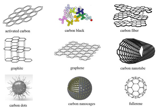 Figure 3. Structures of various carbon-based materials. Reproduced with permission from [61,62,63,64,65,66,67,68,69].