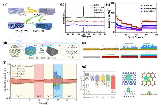 As the temperature decreases, lithium-ion desolubilization energy and electrode polarization increase, resulting in the formation of Li dendritic crystals and the deterioration of battery performance, which seriously affects the low-temperature chemical performance of LIBs [95]. To address this issue, Wang et al. enhanced the low-temperature lithium storage capability of MXene titanium carbide using a surface engineering strategy [87]. They investigated the effects of surface oxygen termination on the effectiveness of lithium storage in MXene materials at low and high temperatures, and they optimized the sintering process to manage the amount of surface oxygen replacement (Figure 5a–c). The surface oxygen-rich Ti3C2Tx(O) and Ti3C2Ox/TiO2 were obtained in air and pure oxygen, respectively. Both of the surface-modified samples maintained the layered structure well, and the surface O-rich Ti3C2Tx(O) showed good electrolyte wettability, which promoted the dissolution of lithium ions and facilitated the lithium intercalation layer. At −20 °C and room temperature, Ti3C2Tx(O) showed better lithium storage performance, which significantly enhanced the chemical performance of LIBs at low temperatures. One of the main issues affecting the stability and safety of lithium-ion batteries is lithium dendrite growth, which causes the electrode and electrolyte interface to become unstable during the battery cycle, destroys the SEI film created, and continues to consume the electrolyte, resulting in the formation of dead lithium and low Coulombic efficiency. Additionally, the development of lithium dendrites could result in diaphragm puncture, internal short-bonding of the LIBs, thermal runaway, and explosion due to combustion. Therefore, in order to decrease the local current density caused by lithium dendrites and enhance the low-temperature electrochemical performance of LIBs, it is necessary to design a high specific surface area anode. By etching Ti3SiC2 in an environment containing SF6, J. Wang et al. successfully created accordion-like S/F codoped carbon to address this issue. Their lithium–SFC composite electrode displayed dendrite suppression and a minimal voltage lag, as illustrated in Figure 5d [88]. Over a wide temperature range (−10 to 50 °C), the SFC–Li anode and LFP cathode exhibited improved cycle stability and rate capability, as well as small voltage polarization (Figure 5e,f). According to DFT simulations and experimental measurements, the increased electrochemical performance is primarily attributable to the uniform nucleation of lithium and the efficient control of stable SEI layers (Figure 5g). This work represents a new approach to the development of low-temperature, high-energy-density, rechargeable lithium metal batteries.
