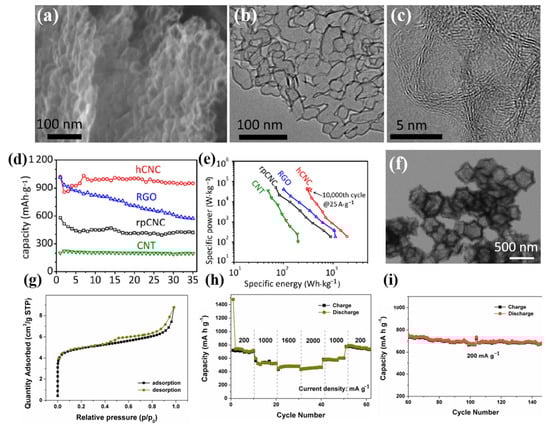 Figure 7. (a): SEM image. (b): TEM image. (c): High-resolution TEM image of the nanocages in (b) with well-graphitized layers in the shell. (d): The reversible capacities at the rate of 0.1 A g−1. (e): Ragone plot for the hCNC-based cell with lithium metal as the counter/reference electrode. The red pentagram represents the specific energy (339 Wh·kgelectrode−1) and specific power (37 kW·kgelectrode−1) for the hCNC after 10,000 cycles at the current density of 25 A·g−1. Comparison of Ragone plots for the hCNC and the rpCNC, CNT as well as RGO-based cells. (ae) Reproduced with permission from [100]. (f): Low-magnification TEM image. (g): Nitrogen adsorption-desorption isotherms. (h): Rate performance at different current densities between 0.01 and 3.0 V. (i): Continued cycling performance of the porous Co-Zn/N-C polyhedral nanocage electrode (the same cell as for (h)) over 80 cycles at 0.2 A g−1. (fi) Reproduced with permission from [101].
