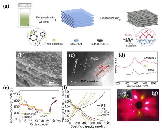 Figure 8. (a): Schematic illustration of the synthesis of s-MoO2/N-C with strong Mo-N-C chemical bonding interactions through a self-template method. (b): SEM images and their corresponding EDS elemental mappings of the prepared s-MoO2/N-C composite. (c): HRTEM images of s-MoO2/N-C. (d): FT-IR spectra of s-MoO2/N-C and commercial MoO2, respectively. (e): Capacity retention of s-MoO2/N-C at the temperature range of 5 °C to −30 °C. (f): Galvanostatic discharge/charge profiles (g): The photograph shows that the battery using the s-MoO2/N-C electrode can light up eight LED bulbs. (ag) Reproduced with permission from [103].