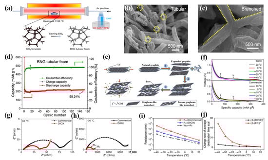 Figure 9. (a): Schematic diagram of the preparation of the BNG tubular foam using the self-sacrifice template CVD method. (b,c): SEM images of BNG tubular foam. (d): Cyclic performance of BNG tubular foam at a current density of 0.1 C. (ad) Reproduced with permission from [89]. (e): Schematic illustration of the Li+ insertion process for natural graphite and porous graphite nanosheet (PGN). (f): Voltage vs. Li+ intercalation capacity over various temperatures at the 0.1 C rate in different electrolytes. (g,h): Nyquist plots of a PGN/CNT electrode measured at (g) 20 °C and (h) −30 °C in different electrolytes. (i): Difference of temperature-dependent resistance in different electrolytes. (j): Relative change rate of an average desolvation time scale of different solvated Li+ at different temperatures. (ej) Reproduced with permission from [49].