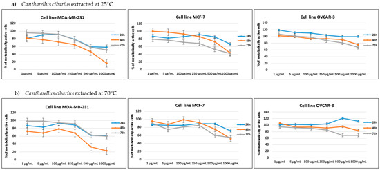 Percentage of metabolically active human breast adenocarcinoma MDA-MB-231, human breast metastatic adenocarcinoma MCF7 and human ovarian carcinoma OVCAR-3 cell lines after 24, 48 and 72 h of incubation with different concentrations of (a) Cantharellus cibarius mushroom extracts at 24 °C and (b) Cantharellus cibarius mushroom extract at 70 °C.