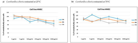 Percentage of metabolically active human mammary epithelial HMEC cell lines after 24, 48 and 72 h of incubation with different concentrations of (a) Cantharellus cibarius mushrooms extracts at 24 °C and (b) Cantharellus cibarius mushrooms extract at 70 °C.