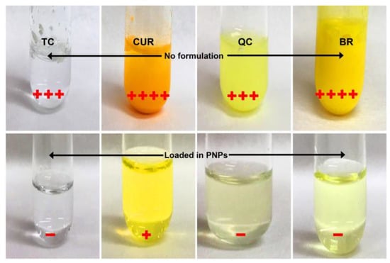Visual assessment of the dispersibility of unformulated and PNP-formulated SrtAIs TC, CUR, QC, and BR in water at 1 mg/mL. Visual assessment of precipitation is semi-quantitatively reported on each image as: −, no precipitation; +, minor precipitation; +++, moderate precipitation; and ++++, major precipitation.