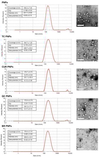Dynamic light scattering intensity distribution and transmission electron microscopy imaging for unloaded β-LG PNPs, as well as TC-, CUR-, QC- and BR-loaded β-LG PNPs. White scale bars represent 2 µm).