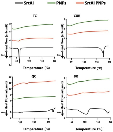 DSC thermograms for each SrtAI (TC, CUR, QC, BR), as well as SrtAI-loaded and empty β-LG PNPs. ‘arb. unit’ indicates arbitrary units.