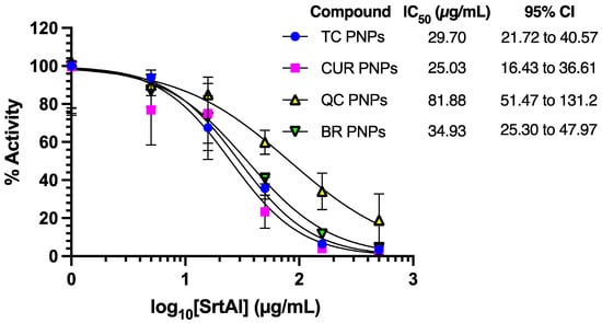 To determine the SrtA inhibition potency for each formulation, kinetic readouts of Abz-LPETGK(Dnp)-NH2 cleavage by the SrtAΔN59 enzyme were recorded over 60 min. From this data, dose-response curves were generated and IC50 values calculated (Figure 4). These data demonstrated that the SrtAΔN59 inhibition potency for BR, CUR, and TC PNPs were similar (IC50 25–35 µg/mL, with overlapping 95% confidence intervals), while QC PNPs were approximately 2–3-fold less potent (IC50 81.9 µg/mL). This data for TC and CUR PNPs were equivalent to what was observed for these SrtAIs when administered in 5% (v/v) DMSO [8]. In comparison, BR was approximately 5-fold more potent (IC50 6.9 µg/mL), and QC 2-fold less potent (42.2 µg/mL), when administered in 5% (v/v) DMSO compared to the PNP formulations. The similar IC50 values observed for these PNP formulations compared to the 5% (v/v) DMSO formulations suggest that the SrtA inhibition that was observed in the presence of 5% (v/v) DMSO could be attributed to the SrtAIs themselves for CUR, QC, and TC. In comparison, the BR PNP formulation was less potent compared to the 5% (v/v) DMSO formulation. Since each SrtAI needs to be released from the PNP formulation in order to inhibit SrtA, this may indicate that BR is not as readily released from the PNPs compared to the other formulations, or that it aggregates upon release from these formulations, reducing its ability to interact with, and inhibit SrtA. Finally, comparison of the IC50 values that were calculated for each SrtAI PNP formulation (Figure 4) to the MIC data in Table 1, indicated that all MIC values were higher than the IC50 values, with the exception of the QC PNP group, and thus significant inhibition of the bacterial SrtA enzyme was likely experienced at the MIC value.