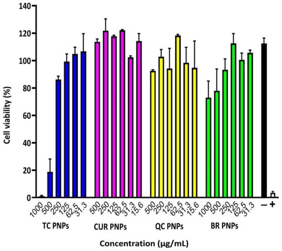 Resazurin cell viability assay for HEK-293 cells in the presence of different concentrations of SrtAI-loaded (TC, CUR, QC, and BR) PNPs at 24 h. The data are expressed as the mean percent cell viability ± SD (n = 3). The positive control (+) consisted of 10% (v/v) SDS, 0.1 M HCl, while the negative control (−) consisted of cells treated with complete media containing 0.01% (v/v) DMSO.