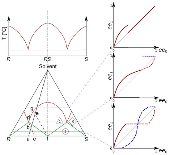11]. As a rule of thumb, it can be assumed that the higher the melting temperature, the lower the solubility. The eutectic composition also has a special role. In thermodynamically controlled systems, it may not be crossed by fractioned recrystallization alone. A eutectic mixture of enantiomers can also be expected to have the highest solubility. The phase equilibrium conditions of crystallizing enantiomeric mixtures in solvents can be discussed using a ternary diagram. A schematized ternary solubility phase diagram [