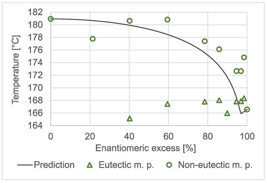 36] based on the measured melting temperatures and fusion enthalpies of the pure enantiomer (166.6 °C; 38,000 J/mol) and those of the racemate (180.9 °C; 40,400 J/mol). Both the measured data and the prediction confirmed that benzylammonium mandelate was a racemic compound and had a eutectic composition of around 94–98%