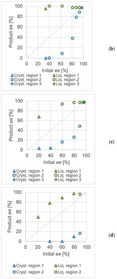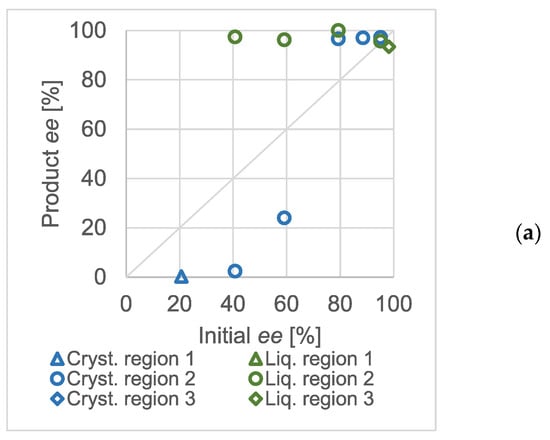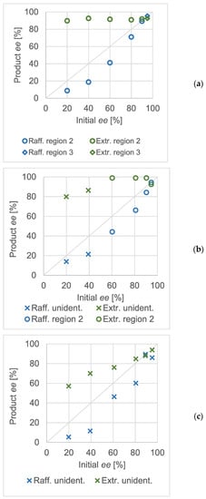 In panel (a), it can be seen that the effect of the thermodynamic control and the ternary plot was spectacular. The enantiomeric purities of the extracts were very similar and were close to the expected eutectic composition of the salt. Therefore, it could be assumed that the total composition of the mixtures in the reactor lays in region ‘2’ of the ternary plot. Interpreting the data in panels (b) and (c) was not as straightforward. In the diagram of panel (b) (the concentration of the salt in the reactor was 1.15 mg/mL), only a few experiments resulted in eutonic extracts. The measurements below a 50% initial ee could not be straightforwardly categorized. Whilst the non-racemic (and non-eutonic) extracts suggested that they belonged in region ‘1’, the raffinates were also non-racemic, which was only characteristic for region ‘2’. The same tendency could be observed when the total concentration of the salt was further decreased (panel c).