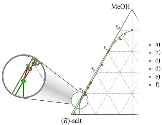 The boundary lines of the diagram’s sections were set in the following order. The points showing an equilibrium between a racemic solid phase and a scalemic mother liquor (triangular markers (‘a’)) formed a clearly followable tendency; hence, a Bézier curve was used as their purely empirical description. According to the chiral melting phase equilibrium of the salt, the eutonic composition was expected to be around 97% ee. All the solutions that contained the salt with a eutectic ee could be represented as the straight line connecting the MeOH corner and the point for this enantiomeric excess value on the axis of the solid materials. The points marked by empty circles (‘b’) show individual experiments where a eutonic mother liquor was expected. Due to the mass balance error and the large magnification of the ternary diagram, these points were scattered in a seemingly wide range. Their average was plotted as a solid circle (‘c’). The solubility of the pure enantiomer was plotted as an X (‘f’). The composition of the mother liquors recovered in experiments with (nearly) enantiopure crystals were plotted as empty diamonds (‘d’). Their average is shown as a solid diamond marker (‘e’). It must be noted that the solubility of the pure enantiomer had to be lower compared with that of a eutectic enantiomeric mixture. Due to this, and also due to the fact that the solid diamond marker lays on the line of the eutectic composition, we decided to use this point as an approximation of the eutonic composition when setting the boundaries of the phase diagram. Connecting it to the solubility point of a pure enantiomer and to the R-corner of the diagram, the boundaries of the third region were formed. Connecting the eutonic composition to the point of a solid racemate (not shown in the diagram due to its magnification), the second region became visible; the first region was enclosed by the curve drawn on the empty circular markers and the line drawn previously.