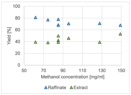 The effect of the methanol concentration did not seem to be dramatic either. However, it was clearly visible that an increase in the amount of organic solvent in the high-pressure vessel affected the amount of crystalline product and extract. The tendency was as expected: the more methanol added, the larger the solubility of the racemic salt and the lower the raffinate yield.