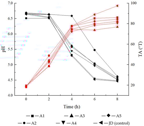 Changes in pH and TA during fermentation. The black and red lines represent pH and TA of the samples, respectively.