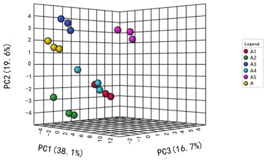 PCA is a multivariate analysis technique that extracts important information from data, represents it as a new set of orthogonal variables called principal components and displays the patterns of similarity amongst observations and variables as points on a graph [32]. The PCA model had a high R2Y value of 0.997 and Q2 value of 0.994, respectively, indicating that the PCA model was accurate and provided good predictability. A total of 38.1%, 19.6% and 16.7% of the variability for PC1, PC2 and PC3 was accounted for. Three groups were separated clearly on the PCA plot (Figure 2). The first group included the A3 and control samples. The second group contained the A1 and A2 samples, and the third group contained the A4 and A5 samples.