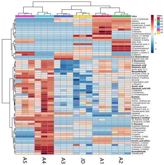 Heatmap of volatile flavour compounds in all samples and the control. The metric of the x-axis is five different ratios of L. delbrueckii subsp. bulgaricus IMAU20312 and S. thermophilus IMAU80809 in starter cultures and the commercial starter culture control, and the y-axis is the concentration of volatile flavour compounds in all samples and the control (JD).